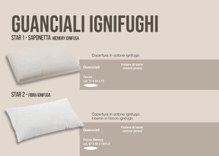 Guanciali Ignifugi Mod. STAR 1 SAPONETTA Memory ignifugo Fiocco Cm. 71x41x12 Copertura in cotone ignifugo Mod. STAR 2 FIBRA IGNIFUGA
