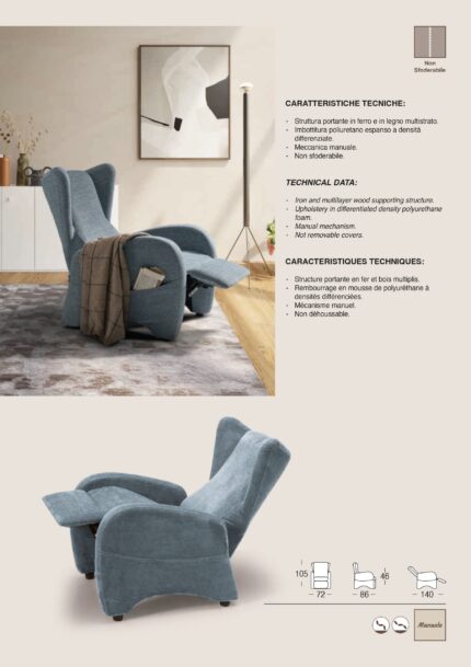 Poltrona Mod. ALIAS Relax Manuale Struttura portante in ferro e legno multistrato Imbottitura poliuretano espanso a densità differenziate Meccanica manuale