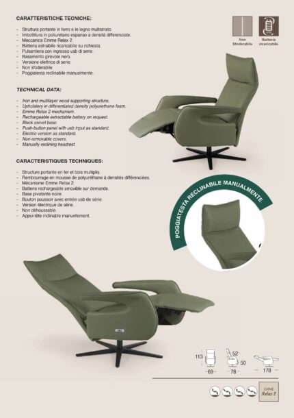 Poltrona Mod. FEDE Relax-Lift Struttura portante in ferro e in legno multistrato Seduta in poliuretano espanso Schienale e poggiatesta in