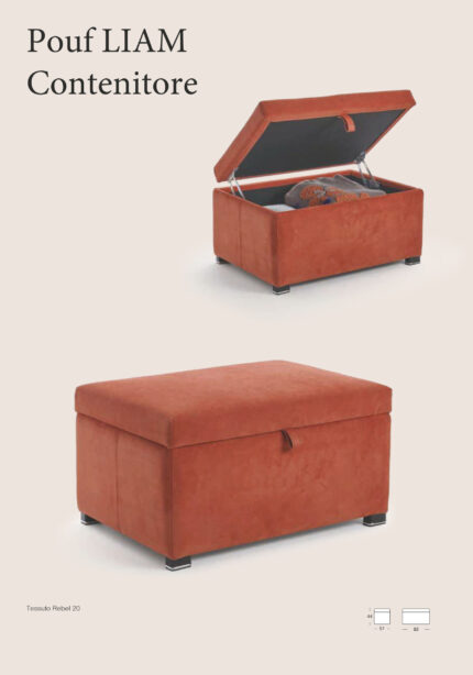 Pouf Contenitore Mod. LIAM LIAM: Rivestito in tessuto Rebel 20 o pelle Lux, questo pouf è un oggetto pratico e