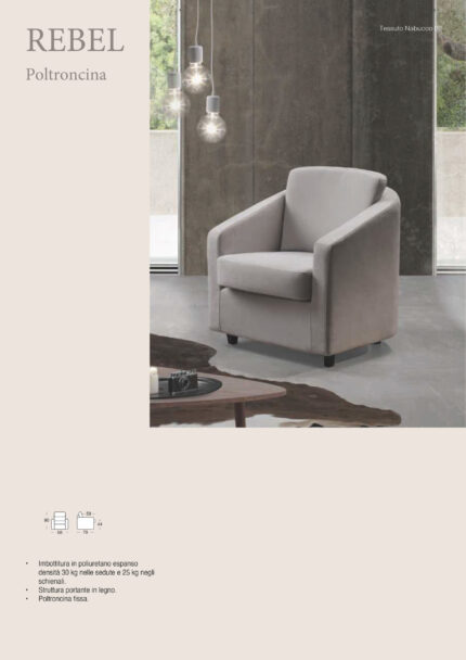 Poltroncina REBEL Imbottitura in poliuretano espanso con densità 30 Kg. nei cuscini di seduta e 25 Kg. sullo schienale. Struttura