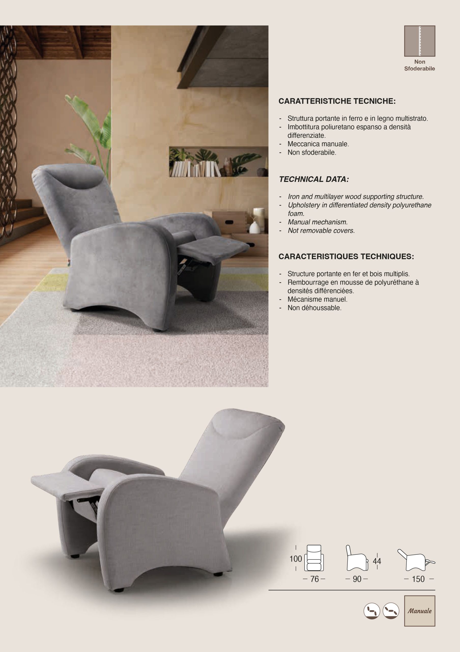 Poltrona Mod. NILY Relax Manuale Struttura portante in ferro e legno multistrato Imbottitura poliuretano espanso a densità differenziate Meccanica manuale