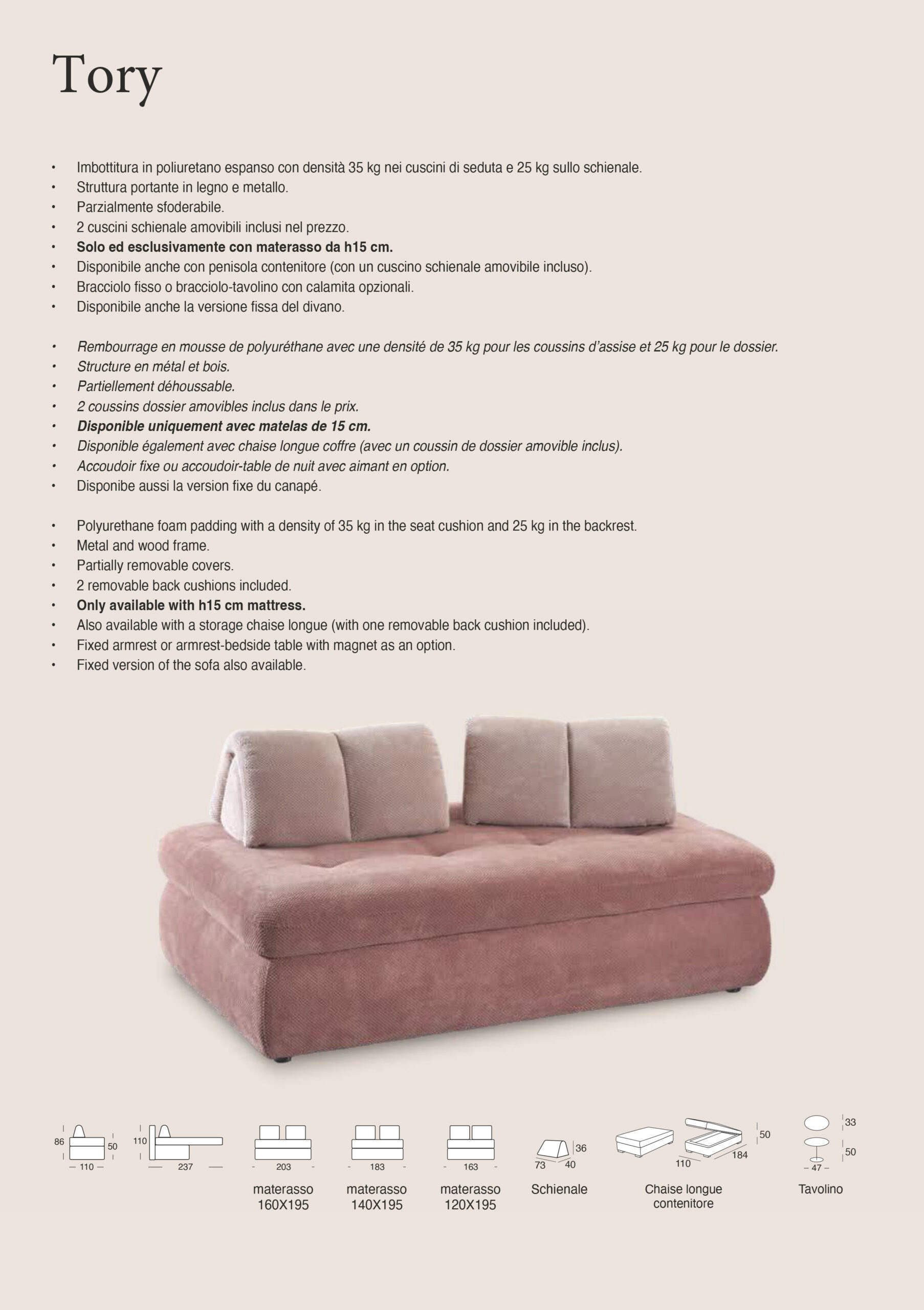 Divano Letto Mod. TAO TAO Imbottitura in poliuretano espanso con densità 35 kg nei cuscini di seduta e 25 Kg